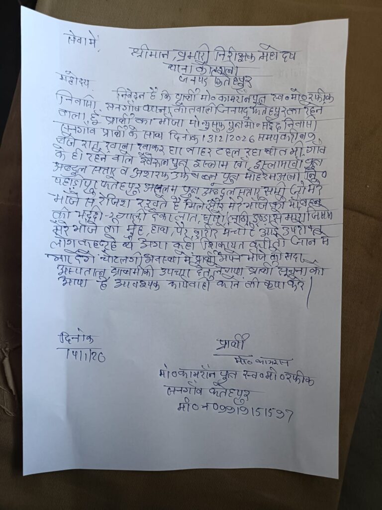 – शिकायत के बावजूद पुलिस ने नहीं दर्ज की FIRफतेहपुर से एक बड़ी खबर सामने आ रही है। सदर कोतवाली क्षेत्र के सनगांव गांव में मामूली कहासुनी ने अचानक हिंसक रूप ले लिया। देखते ही देखते दोनों पक्ष आमने-सामने आ गए और जमकर लाठी-डंडे चले।इस खूनी झड़प में मोहम्मद यूसुफ गंभीर रूप से घायल हो गए। परिजनों का आरोप है कि नामजद आरोपियों ने मिलकर उन पर लाठी-डंडों से हमला किया, जिससे वह लहूलुहान होकर जमीन पर गिर पड़े। घायल अवस्था में उन्हें तुरंत अस्पताल में भर्ती कराया गया, जहां उनका इलाज जारी है।घटना के बाद पीड़ित परिवार सदर कोतवाली पहुंचा और आरोपियों के खिलाफ नामजद शिकायत दी। लेकिन परिजनों का आरोप है कि शिकायत देने के बावजूद अब तक पुलिस ने मामला दर्ज नहीं किया है। इसी को लेकर परिवार और स्थानीय लोगों में भारी आक्रोश देखा जा रहा है।स्थानीय लोगों का कहना है कि यदि समय रहते आरोपियों पर कार्रवाई नहीं हुई तो विवाद और बढ़ सकता है।वहीं पुलिस का कहना है कि मामले की जांच की जा रही है।अब बड़ा सवाल यह है कि क्या पीड़ित को समय पर न्याय मिलेगा, या फिर मामला दबा दिया जाएगा?