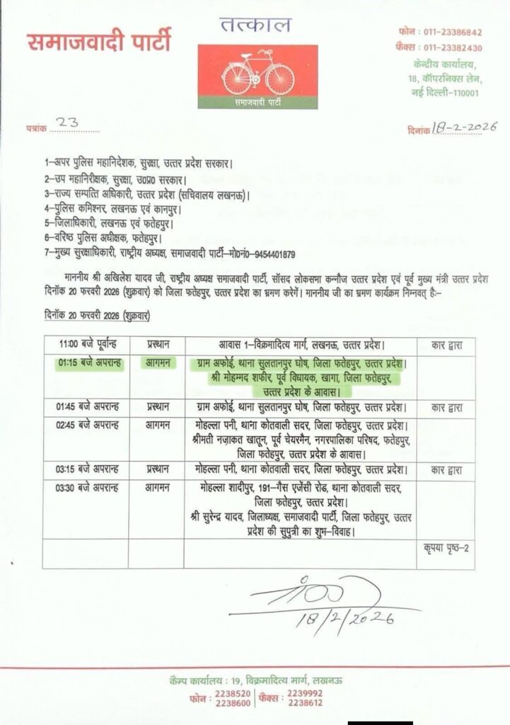 लखनऊ/फतेहपुर। समाजवादी पार्टी के राष्ट्रीय अध्यक्ष, कन्नौज सांसद और पूर्व मुख्यमंत्री अखिलेश यादव कल यानी 20 फरवरी 2026 (शुक्रवार) को फतेहपुर जनपद के दौरे पर रहेंगे. उनके आधिकारिक प्रोटोकॉल के अनुसार, वह जनपद में विभिन्न नेताओं के आवास पर जाएंगे और आयोजित कार्यक्रमों में सम्मिलित होंगे.
